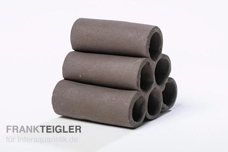 Der tönerne Röhrenturm aus dem Hause Aquariumkeramik ist aus 6 Röhren gefertigt. Eine jede der gebrannten Röhren verfügt über eine Länge von ungefähr 6 – 7 cm bei einem Durchmesser von zirka 1,5 cm. Bei der Herstellung wurde ein sogenanntes Schlickverfahren angewandt, was die zusätzliche Verwendung von Klebstoff unnötig macht.