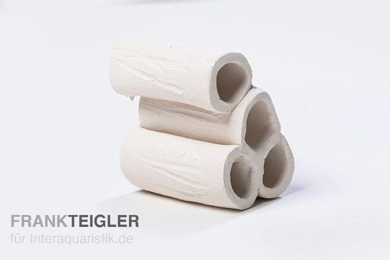 Der tönerne Röhrenturm aus dem Hause Aquariumkeramik ist aus 4 Röhren gefertigt. Eine jede der gebrannten Röhren verfügt über eine Länge und ungefähr 6 – 7 cm bei einem Durchmesser von zirka 1,5 cm. Bei der Herstellung wurde ein sogenanntes Schlickverfahren angewandt, was die zusätzliche Verwendung von Klebstoff unnötig macht.