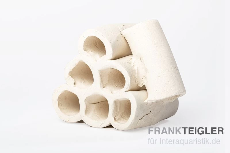 Der tönerne Röhrenturm aus dem Hause Aquariumkeramik ist aus 7 Röhren gefertigt. Eine jede der gebrannten Röhren verfügt über eine Länge und ungefähr 6 – 7 cm bei einem Durchmesser von zirka 1,5 cm. Bei der Herstellung wurde ein sogenanntes Schlickverfahren angewandt, was die zusätzliche Verwendung von Klebstoff unnötig macht.