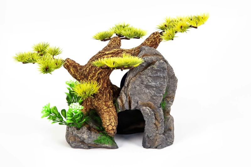 Liebevoll gestaltete Höhle inklusive Bonsai für Aquarien.
