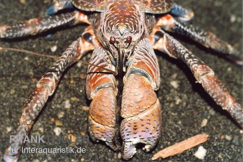 Der Palmendieb, welcher auf die wissenschaftliche Bezeichnung Birgus latro hört, kann alternativ auch als Kokosnussräuber betitelt werden. Bei diesem Krebs handelt es sich um einen imposanten Vertreter aus der Familie der Landeinsiedlerkrebse (Coenobitidae). Mit seiner Körperlänge von nahezu 40 cm zählt der Birgus latro zu einem der größten Landeinsiedlerkrebse weltweit. Der Lebensraum des Palmendiebes erstreckt sich über die ozeanischen Inseln sowie vereinzelte Inseln im West-Pazifik und im Indischen Ozean. Insbesondere auf den Weihnachtsinseln oder den Cookinseln lassen sich zahlenmäßig große Populationen feststellen. In seinem natürlichen Habitat hält sich der Birgus latro weitestgehend an Land auf. Er ist in erster Linie in Sandlöchern oder Felsenspalten anzutreffen. Palmendiebe sind nachtaktiv. Sie halten sich tagsüber in ihren Verstecken auf, welche sie mit einer ihrer Scheren verschließen. Auf diese Art und Weise wird in der Höhle ein feuchtes Mikroklima erzeugt. Die Krebstiere ernähren sich hauptsächlich von Obst und Früchten. Ihnen wird nachgesagt, dass sie selbst Kokosnüsse knacken können. Dieser Tatsachenbestand brachte den Tieren den Beinamen „Kokosnussräuber“ ein. Palmendiebe sind beeindruckende Gestalten. Neben ihrer Größe ziehen die Zehnfußkrebse insbesondere durch ihre roten Augen, der großen Scheren sowie seiner immensen Körperkraft alle Blicke auf sich.